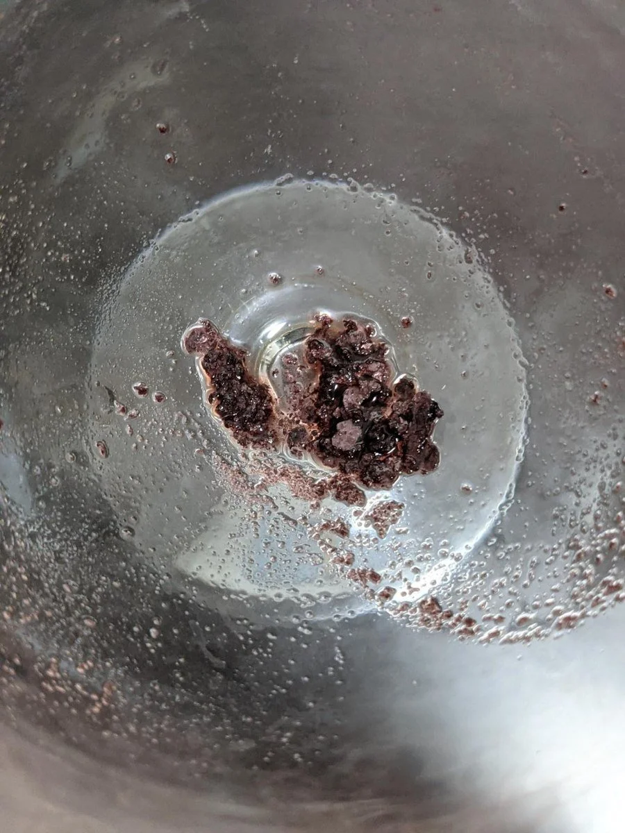 Sediment of a Bordeaux 2011 wine opened in 2021, with crystals of tartaric acid visible in the glass. Photo: Capsellanaut