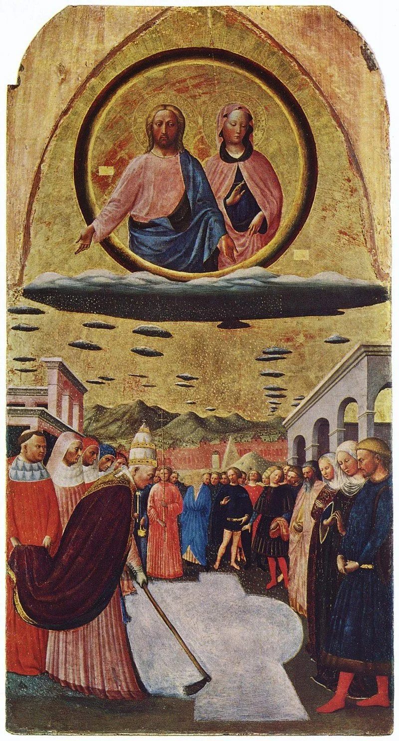 “The Miracle of the Snow” by Masolino da Panicale (1383-1447). Christ and the Blessed Virgin Mary observe Pope Liberius, who marks in the legendary snowfall the outline of what would be the Basilica of St. Mary Major in Rome, Italy. Source: The Yorck Project