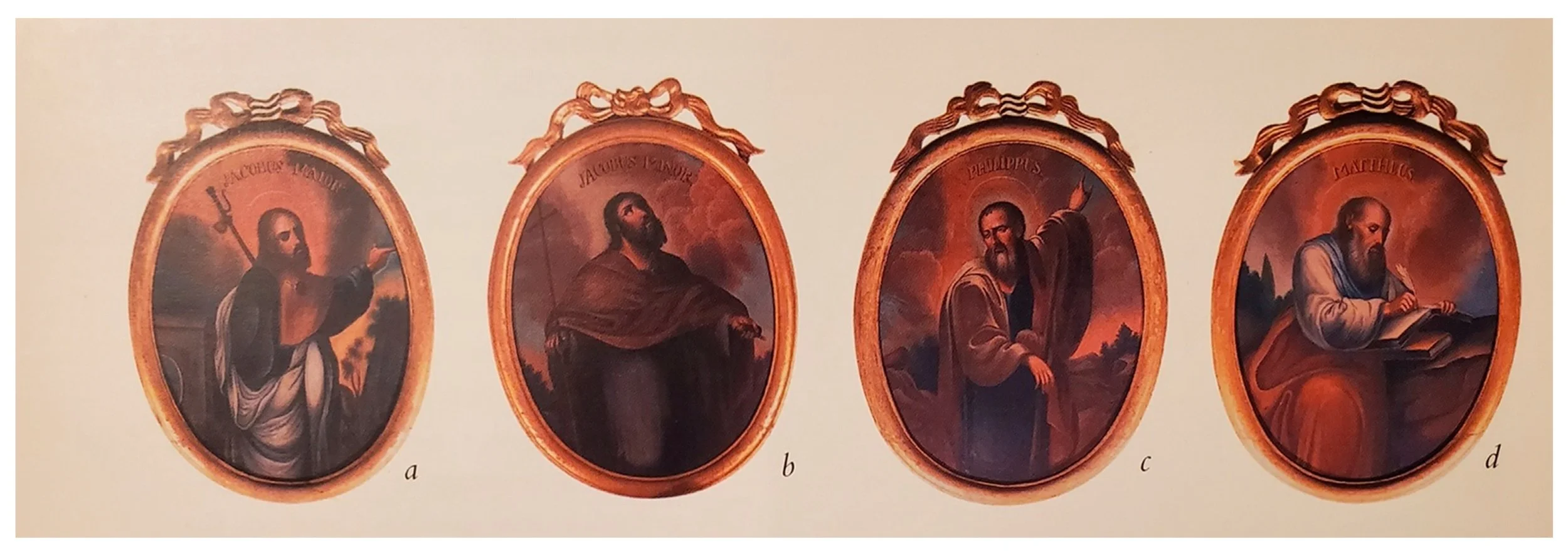 Figure 7. Images of the apostles (a–d). Francisco Velásquez, medallions, end of 18th century, oil on panel, Cathedral of Santa María la Menor, Santo Domingo. From Arte Sacro Colonial en Santo Domingo (2002), p. 48. Copyright: Fundación de la Zona Colonial, Inc. 2002.